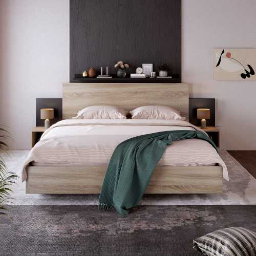 - Modernes Design: Natürliches Holz und Schwarz – eine zeitlose Kombination, die sowohl modern als auch klassisch wirkt. Das Bettgestell ist in Sonoma-Eiche Farbe gehalten und wird durch schwarze Akzente ergänzt, die dem Bett eine elegante und markante Note verleihen. Die Kombination aus dem warmen Holzton und dem kühlen Schwarz schafft ein ausgewogenes und harmonisches Gesamtbild, das in jedes Schlafzimmer passt.